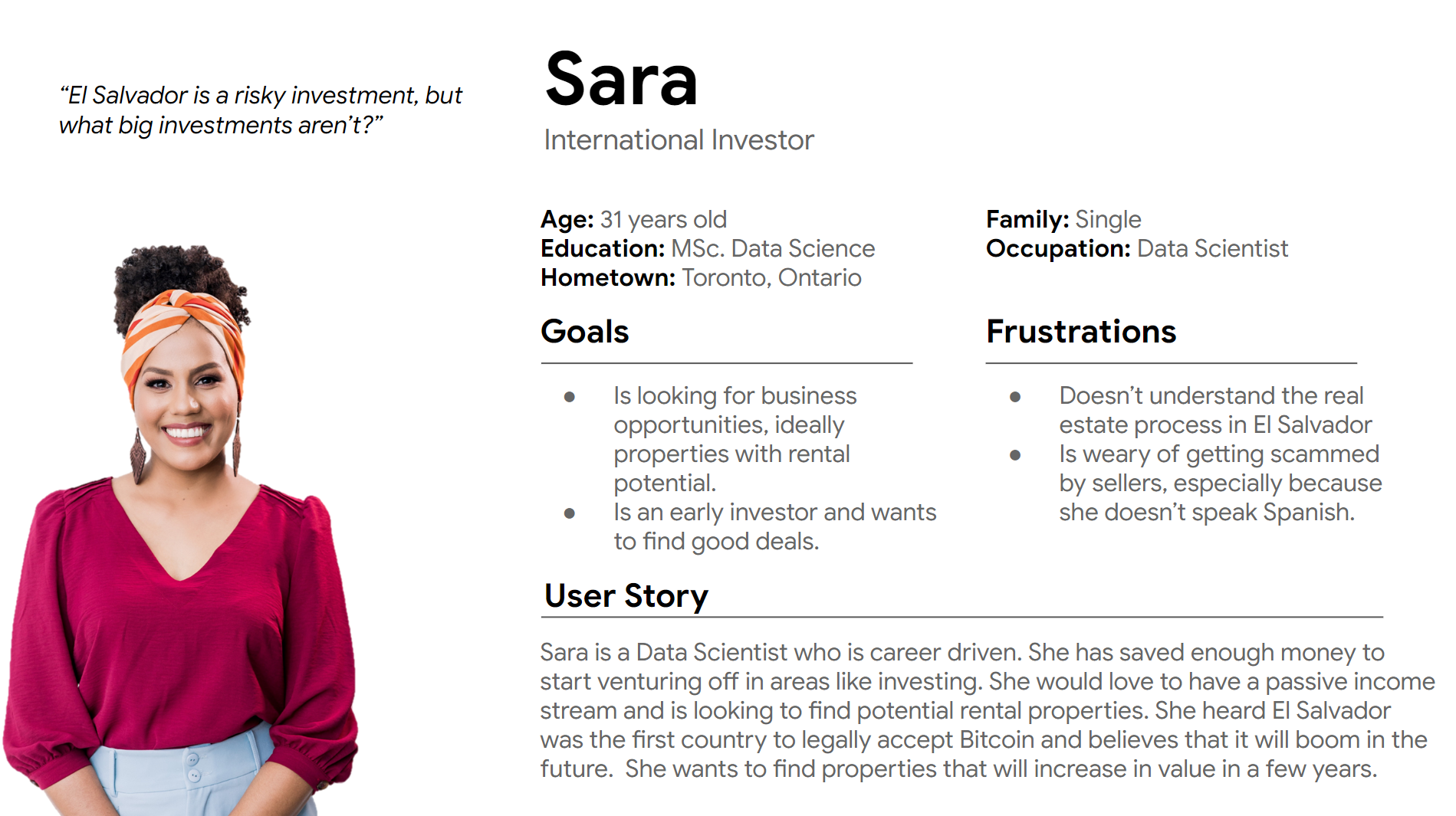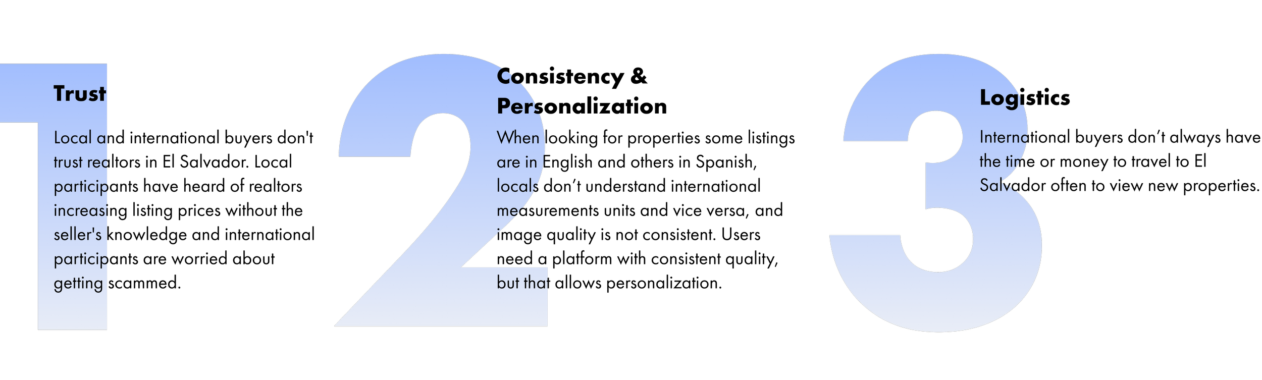 I conducted 3 interviews ( 2 international users and 1 local user) in order to understand what current challenges they face when trying to find and purchase properties in El Salvador. I derived three main insights: