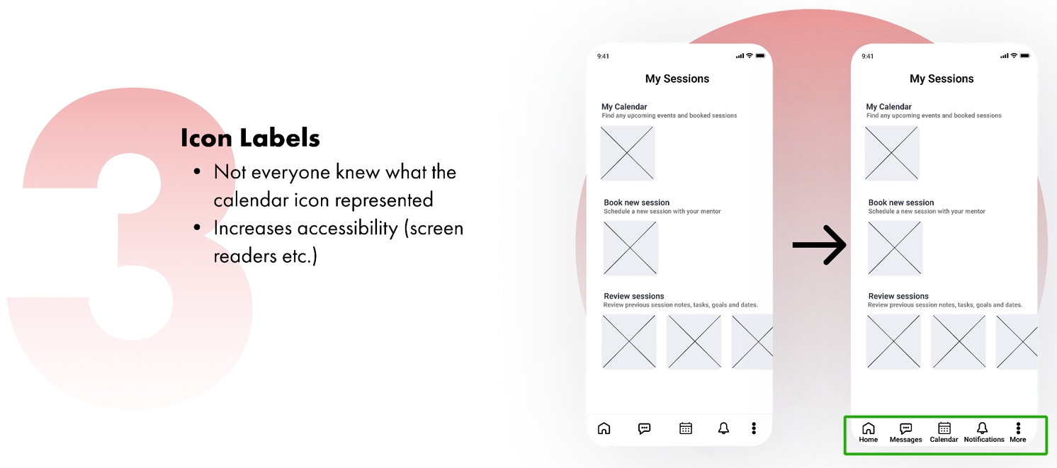 Throughout the earlier stages of my design I focused on some accessibility features such as colour contrast and text hierarchy. However, In the later stages I found myself having to resize fonts and add text to icons. Considering accessibility features at the beginning of the process will create a design that is easier to use for everyone.